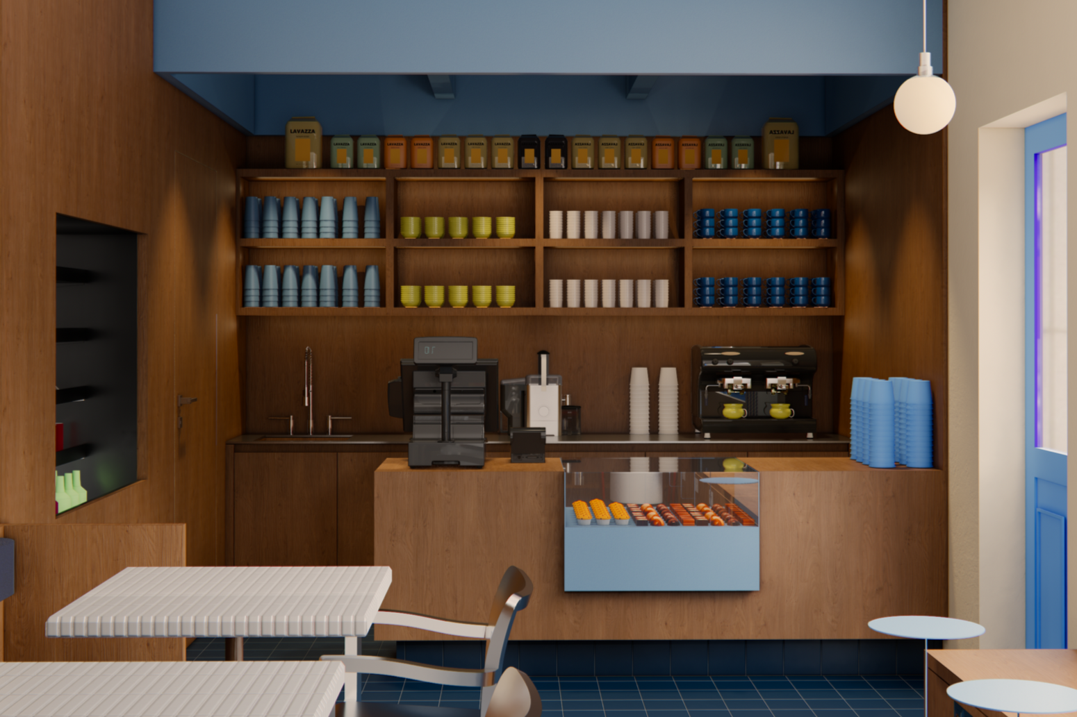 Pulse interiors a imaginé ce projet conceptuel comme un lieu qui vit au rythme de la journée. Il est accessible à tout moment de la journée. Un café lumineux le matin, et se transforme en un bar chaleureux en fin de journée.